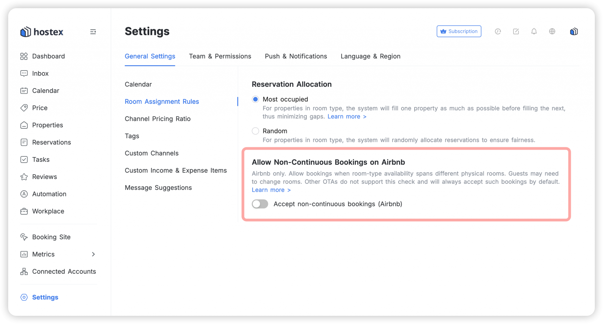 The “Allow Non-Continuous Bookings” feature is designed for hosts using Hostex’s multi-inventory management for Airbnb listings. While Airbnb doesn’t natively support multiple units under one listing, Hostex enables this through its Room Type Management. This feature handles bookings where consecutive nights are available across different physical properties within the same room type.